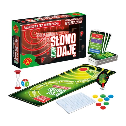 kolorowa kostka, 110 kart, 8 żetonów, klepsydra, pionek, notes, plansza, instrukcja