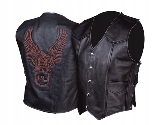 Kamizelka skórzana motocyklowa model KM002 marki L&J RYPARD. Model ten jest jednym z najbardziej wyróżniających się i najbardziej przykuwających oko na Polskim rynku kamizelek motocyklowych. Tłoczony orzeł na plecach "PL" to najlepsze okazanie patriotyzmu i przywiązania do kraju, z którego pochodzisz. Bogate wzornictwo i design nadają kamizelce wyjątkowego i niespotykanego stylu. Zapinana na stalowe zatrzaski w kolorze chrom, podszyta materiałem poliestrowym zapewniającym odizolowanie od lica skóry, co zapobiega przyklejaniu i odparzeniom. Wiązania rzemieniami po bokach ułatwią dopasowanie rozmiaru do każdej sylwetki nabywcy. Doskonały i sprawdzony wybór dla każdego motocyklisty ceniącego nietuzinkowość.