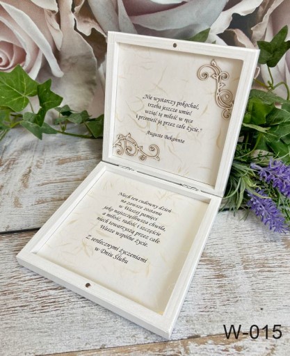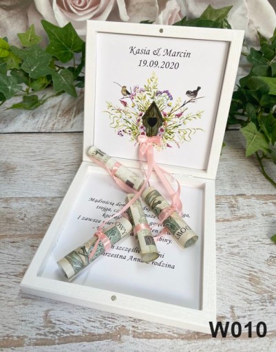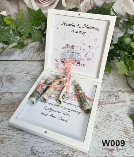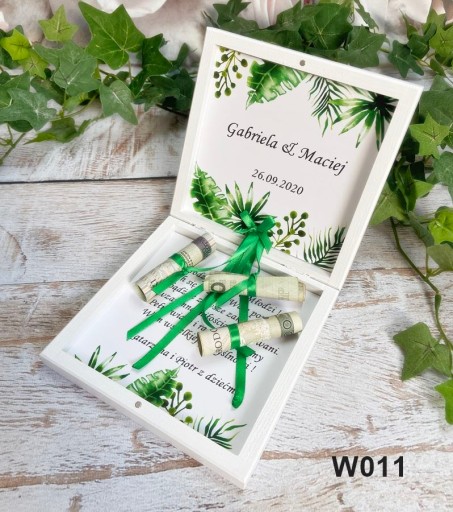 środek personalizowany wkładki z wstążeczki do których ,możemy dowiązać zwinięte w rulonik banknoty ( banknoty nie stanowią wyposażenia pudełka to tylko propozycja iż umieszczenia w pudełku)