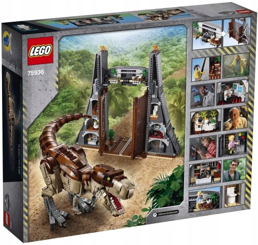 Ta zabawka kolekcjonerska składa się z 3120 klocków i zawiera oryginalną, kultową bramę z Parku Jurajskiego oraz w pełni ruchomą, zbudowaną z klocków figurkę tyranozaura, którą możesz postawić na półce. Otwierana za pomocą przycisku brama jest osadzona w konstrukcji z siedmioma szczegółowymi, zbudowanymi z klocków scenami przedstawiającymi miejsca z filmu, takie jak jadalnia Johna Hammonda, centrum sterowania Raya Arnolda i bunkier Iana Malcolma. Ten zestaw konstrukcyjny to pozycja obowiązkowa dla wszystkich fanów filmu Jurassic World — zawiera 6 minifigurek, figurkę małego dinozaura oraz ministojak wystawowy z tabliczką, na której znajdują się informacje na temat tyranozaura.