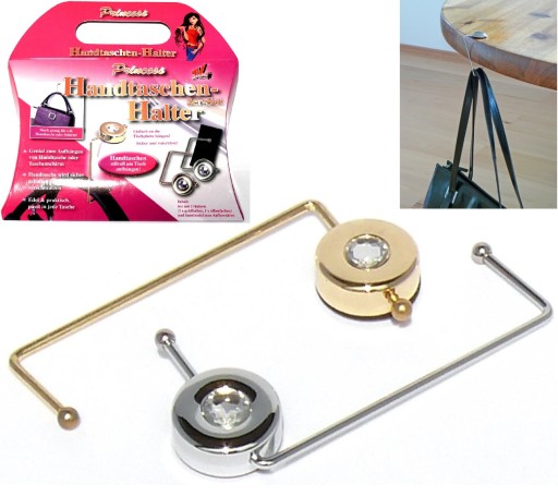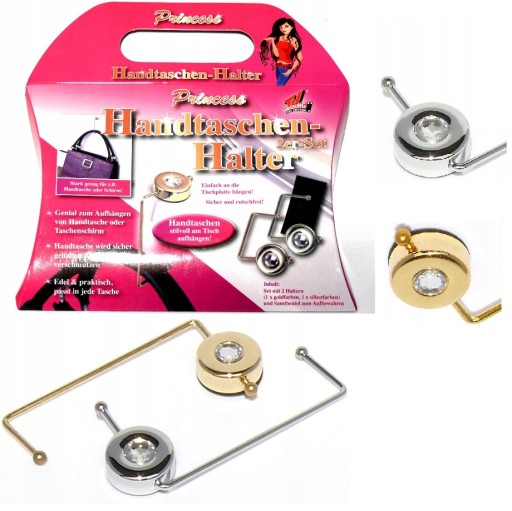 - Praktyczne uchwyty na torebki Princess to wspaniały pomysł na prezent i rozwiązanie dla wszystkich kobiet, które nigdy nie postawiłyby swojej ukochanej torebki na brudnej podłodze ani nie powiesiłyby jej bez opieki na oparciu krzesła.