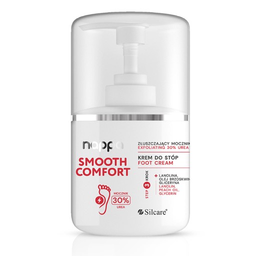 NAPPA Krem do stóp z mocznikiem 30% to aksamitny krem, oparty na mieszance oleju brzoskwiniowego i lanoliny, które działają natłuszczająco, odżywczo i wygładzająco, a przy tym chronią skórę i wspomagają jej regenerację. Dodatek gliceryny pomaga wiązać wodę w naskórku, co wpływa na utrzymanie optymalnego poziomu elastyczności i nawilżenia oraz chroni przed nadmiernym wysychaniem. Zawarty w kremie mocznik 30% zapewniaintensywne złuszczanie zrogowaceń, zwiększa przepuszczalność warstwy rogowej skóry, umożliwiając przenikanie w jej głąb substancji czynnych. Przy tym zapobiega twardnieniu pięt, a także wykazuje działanie przeciwbakteryjne i łagodzące.