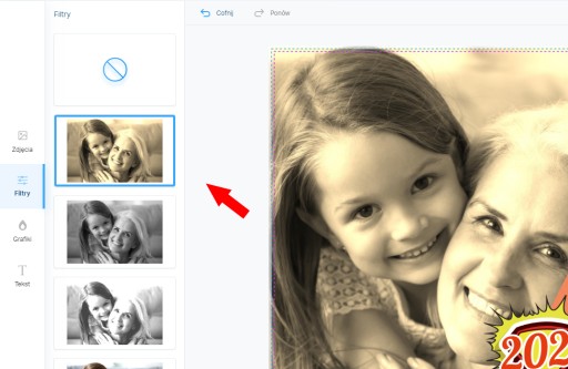 Nasz kreator daje Ci także możliwość skorzystania z różnego rodzaju filtrów. Dla każdego zdjęcia z osobna!