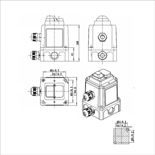 Montaż kabli za pomocą 2 dławików. Mogą współpracować z czujnikami termicznymi wbudowanymi w uzwojenie silnika, wyłączając silnik w przypadku przekroczenia dopuszczalnej temperatury uzwojenia.