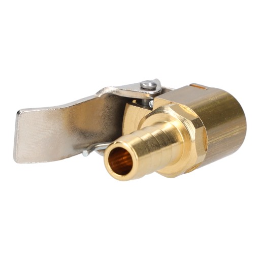 Mosiężna końcówka do pompowania kół włoskiej firmy WONDER z tuleją na wąż 8 mm . Końcówka do pompowania została wyposażona w klips zaciskowy, który pozwala na pompowanie koła bez konieczności ciągłego trzymania końcówki na zaworze podczas pompowania. Tuleja końcówki pozwala na zamontowanie przewodu gumowego o średnicy wewnętrznej 8 mm. Produkt bardzo wysokiej jakości. Końcówkę można zamontować do większości pistoletów do pompowania.