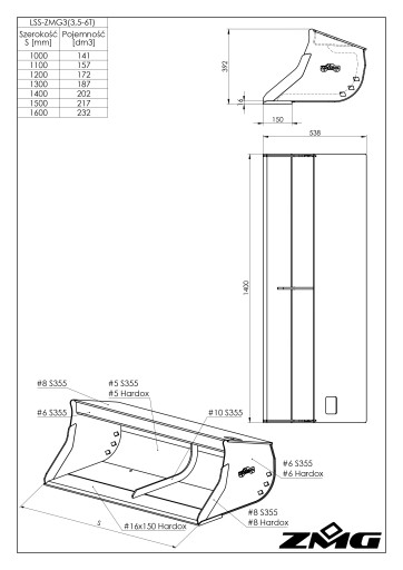 – szerokość lemiesza: #16×150 HB500 dla łyżek skarpowych
