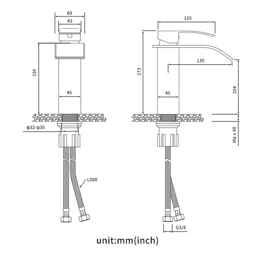 Odległość wylotu wody od środka otworu montażowego: 135 mm