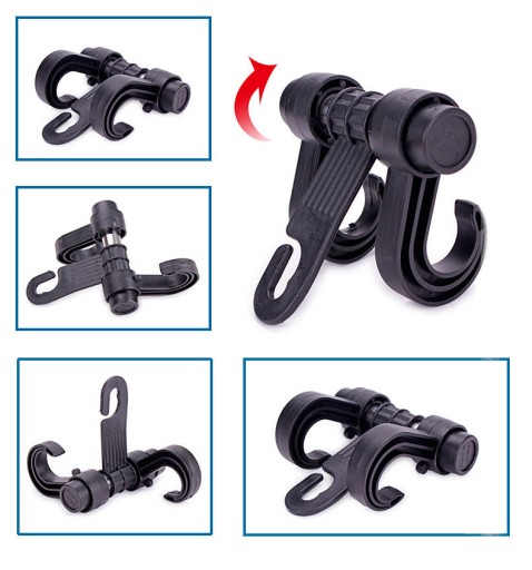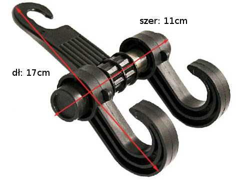 Bardzo prosty montaż za pręt nagłówka. Siatki z zakupami zwisają wówczas za fotelem kierowcy lub pasażera. Wieszak posiada dwa ruchome uchwyty, za pomocą których można ustawić dowolny kat ułożenia wieszaka.