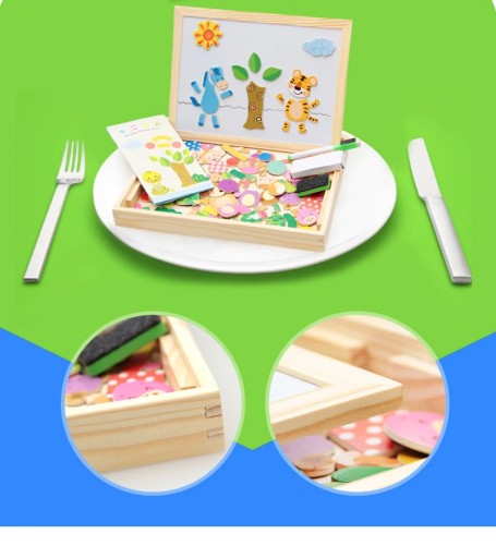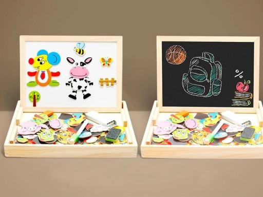 Wystarczy obrócić tablicę, aby wykorzystać ścieralną stronę idealną do nauki pisania i liczenia. Dodatkowo można wykorzystać magnetyczne akcesoria do zabawy i tworzyć ciekawe kompozycje.