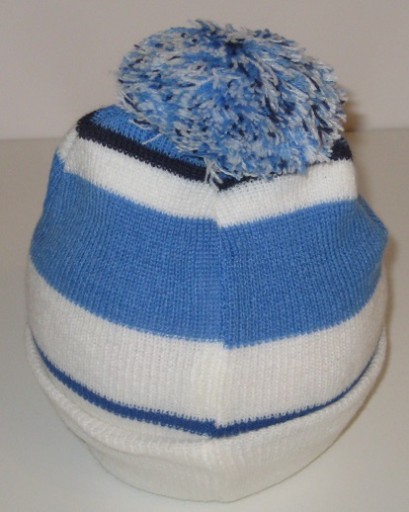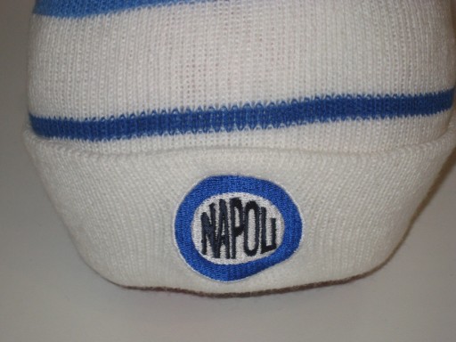 Zimowa czapka dla dziecka - Napoli. Rozmiar: średnica 18 cm. Materiał: akryl. Kolor: biały/niebieski. Używana. Stan jak na zdjęciach. Z Włoch. Cena za 1 szt.