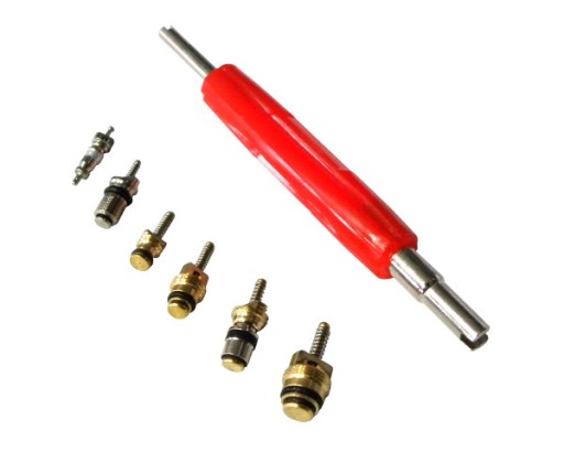 - W skład zestawu wchodzi klucz do wykręcania / wkręcania zaworków oraz 6 różnych typów zaworków.