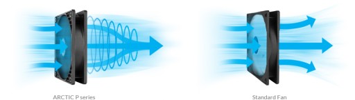 Podczas opracowywania nowego P12 szczególny nacisk położono na skoncentrowany strumień powietrza, a tym samym wysokie ciśnienie statyczne. Wentylator gwarantuje niezwykle wydajne chłodzenie, nawet przy zwiększonym oporze powietrza. Dlatego P12 jest szczególnie odpowiedni do stosowania na radiatorach. Skutecznie wydmuchuje gorące powietrze z obudowy bądź wpuszcza chłodne.