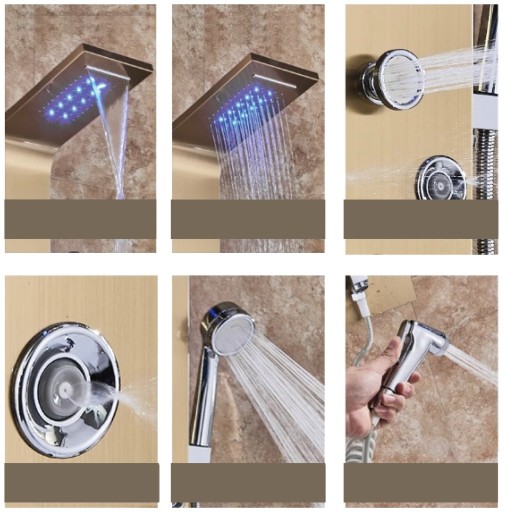 To ekskluzywny, stylowy, nowoczesny panel prysznicowy z hydromasażem, wodospadem, deszczownicą i diodami LED .