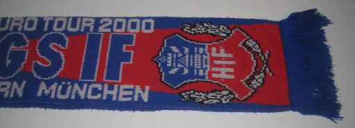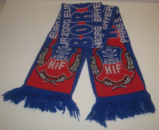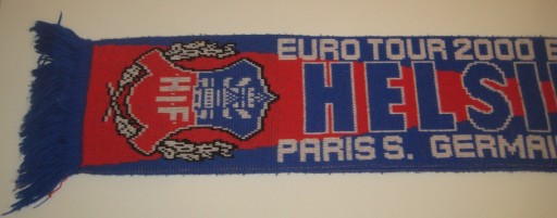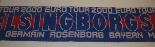 Szalik kibica - Euro Tour 2000 - Helsingborgs IF - PSG - Rosenborg - Bayern Munchen. Dwustronny. Używany. Stan jak na zdjęciach. Drobne plamki - do odświeżenia. Ze Szwecji. Cena za 1 szt.
