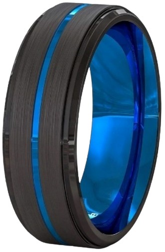 Черное кольцо-печатка с синей линией СТАЛЬ