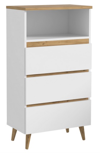 System Norge to prostota i elegancja, wykorzystanie arktycznej bieli i ciepłego dębu craft, co stanowi idealne połączenie. Meble z tej kolekcji osadzone zostały na nóżkach z naturalnego drewna bukowego, zaimpregnowane przez olejowanie.