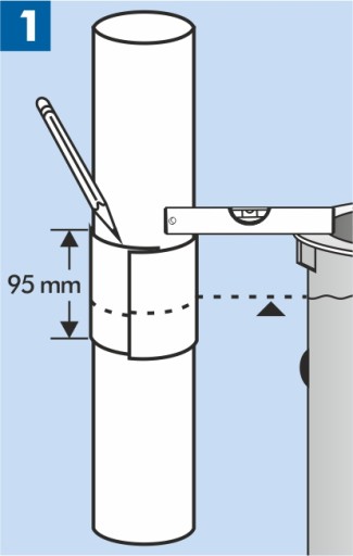 1. Zaznacz górną krawędź zbieracza na deszczówkę na rurze spustowej, 95 mm poniżej dolną krawędź.