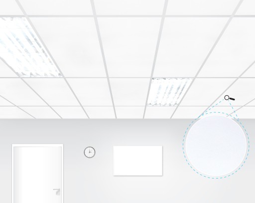 Akustyczna płyta sufitowa o gładkiej, białej powierzchni, którą można czyścić odkurzaczem. Panele akustyczne ze skalnej wełny mineralnej są dostępne w wielu wymiarach, do montażu z konstrukcją częściowo ukrytą lub widoczną. Klasa odporności ogniowej A1.