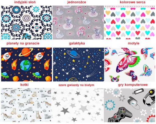 Przy zakupie proszę w informacjach do sprzedającego podać wybrany wzór, jaka ma być podusia, kolor wafla bawełnianego oraz grubość ocieplenia.