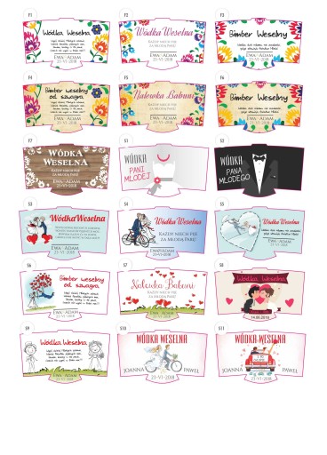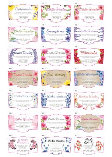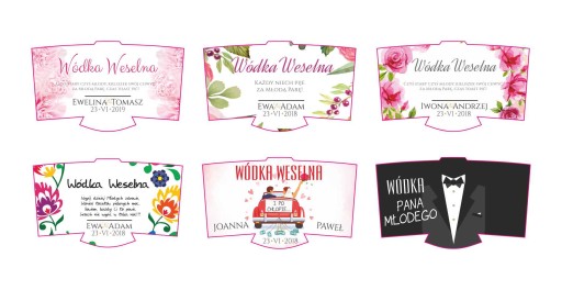 Eleganckie, oryginalne naklejki na alkohol weselny. Wiele ciekawych, niepowtarzalnych wzorów.
