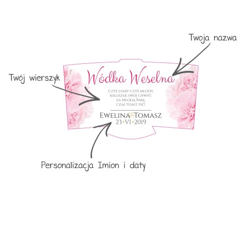 Dane na naklejkach mogą być dowolne (dowolny wiersz, dedykacja, imiona, nazwa trunku itp.)