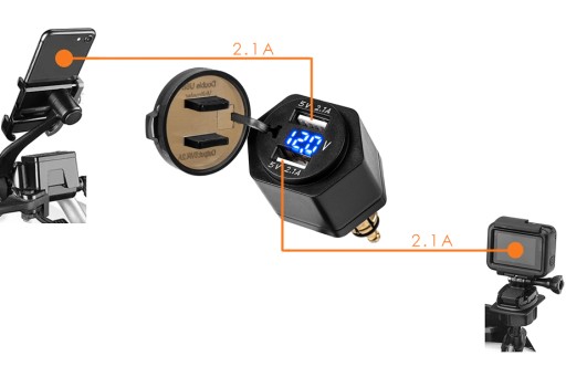 Gniazdo USB do motocykli BMW / Triumph rozwiązuje problem ładowania / zasilania różnego rodzaju urządzeń elektrycznych. 4.2 A na gniazdach USB, pozwala szybko ładować praktycznie każdy telefon, nawigację GPS, tablet czy kamerę. Elektroniczny system zarządzania ładowaniem dostosowuje natężenie prądu do danego urządzenia, gniazda USB nie dadzą więcej niż urządzenie jest w stanie przyjąć.