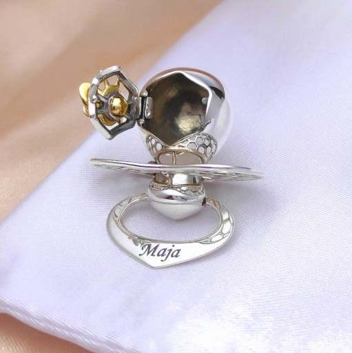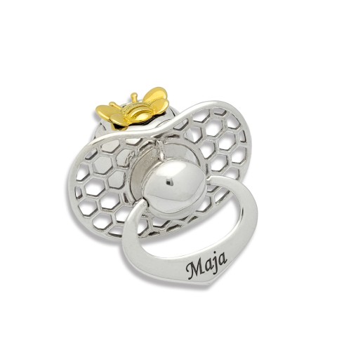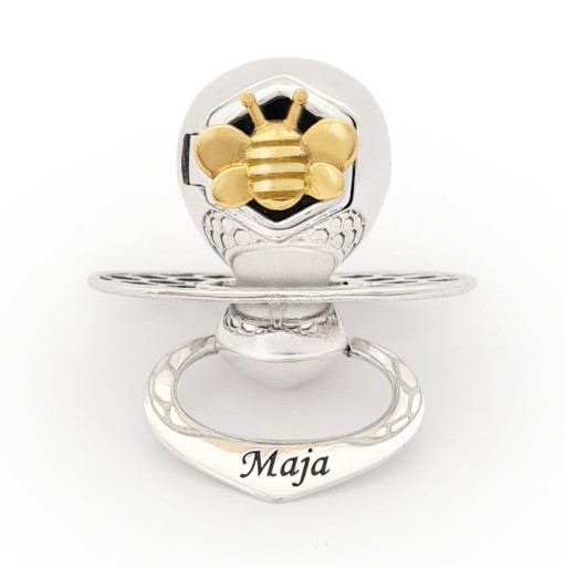 Wyjątkowy i oryginalny srebrny smoczek z pozłacaną pszczółką i schowkiem na pierwszy ząbek!