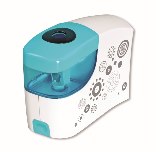 Automatyczna temperówka na baterie typu AA (4 sztuki, niedołączone do opakowania) wyposażona w dwa wymienne mechanizmy ostrzenia z otworami różnej średnicy (11 mm, 8 mm).