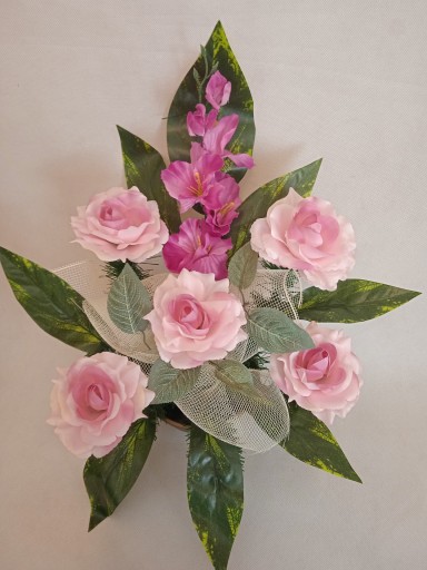 Kompozycja na grób (tzw. stroik, ikebana) jest wykonana na sztucznej choinie która jest zabetonowana w doniczce plastikowej okrągłej o średnicy 12 cm od dołu i 16 cm od góry i wysokości 7 cm.