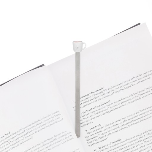 - Odwzorowano kształt kubka, a nawet jego ozdobę w kształcie ziarna kawy. Udało się też uzyskać idealną barwę pobudzającego napoju. Aż trudno w to uwierzyć, ale zakładkę w całości wykonano ze stopu cynku. Kubek widnieje na długim pasku, który chowa się w książce, pozostawiając na widoku genialną figurkę.