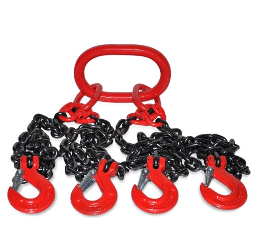 Zawiesie łańcuchowe 4-cięgnowe zakończone ogniwem zbiorczym wraz hakami widełkowym z zabezpieczeniem przed wypięciem cięgna zabezpieczoną zapadką