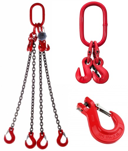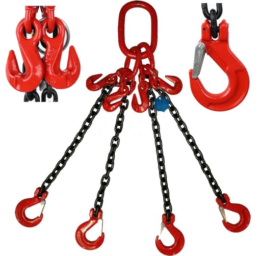 Zawiesie łańcuchowe 4-cięgnowe ogniwem zbiorczym + HAKI SKRACAJĄCE wraz z hakami widełkowymi z zabezpieczeniem przed wypięciem cięgna z zapadką.