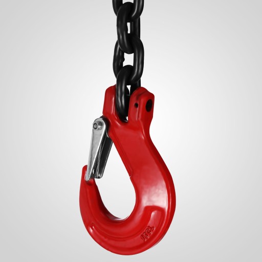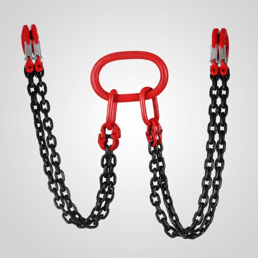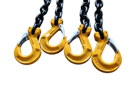 Zawiesie łańcuchowe 4-cięgnowe ogniwem zbiorczym i hakami widełkowymi z zabezpieczeniem.