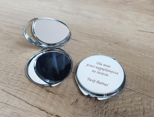 Dwa lusterka - zwykłe i powiększające. Na jednej ze ścianek obudowy umieścimy za pomocą graweru laserowego dowolny napis lub grafikę.