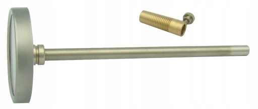 Termometr tarczowy z sondą o długości 150mm. Sonda wykonana ze stali nierdzewnej. Zakres pomiaru od 0 do +500 stopni C. Termometr często używany do pomiaru spalin w kotłach, piecach itp. Przesuwany króciec pozwala swobodnie regulować wysunięcie sondy.