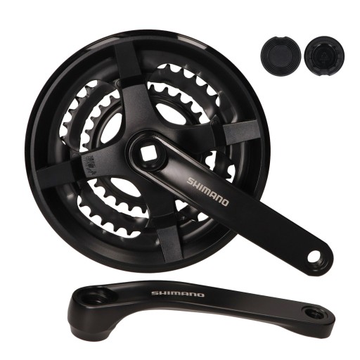 Podstawowa 3-rzędowa korba z osłoną łańcucha z oferty Shimano. Posiada mocowanie suportu na kwadrat. Dedykowana do napędów 6/7/8-rzędowych. W skład zestawu wchodzą: prawe ramię z tarczami, lewe ramię oraz zaślepki śrub.