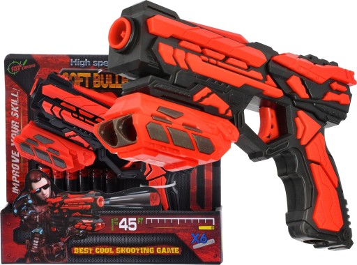 Zawartość zestawu: 1 pistolet, 6 piankowych strzałek, wsuwany po lufę podajnik do naboi.
