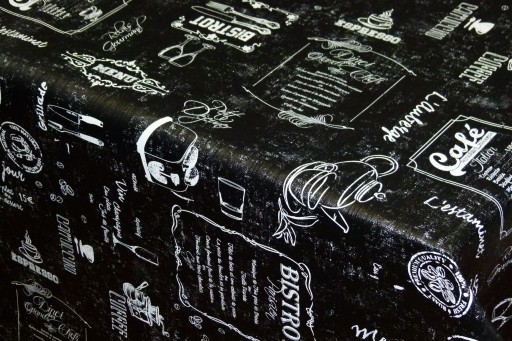 Cerata czarna w białe napisy - posiadająca strukturę o szerokości 140cm +/- 2cm