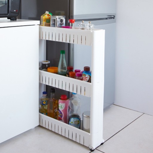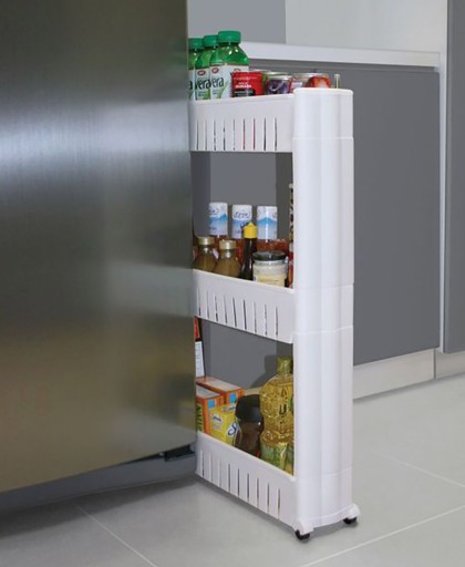 Półka idealnie spisuje się w kuchniach, dzięki wąskiej konstrukcji i praktycznym kółkom, zajmuje niewiele miejsca i może służyć np do przechowywania napojów, przypraw, płatków śniadaniowych. Półkę można świetnie wpasować w szczelinę między meblami, dzięki czemu jest praktycznie niewidoczna a przy tym bardzo wygodna w użytkowaniu.