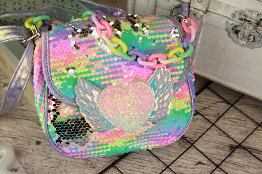 Zaskakujące magiczce cekiny z kolorowych po przełożeniu zmieniają się w kolor srebrny. Przy klapce torebki znajduje się brokatowe serduszko z fantastyczny holo skrzydełkami, które dodają uroku torebce. Dodatkowo przy torebce jest doczepiony kolorowy łańcuszek.