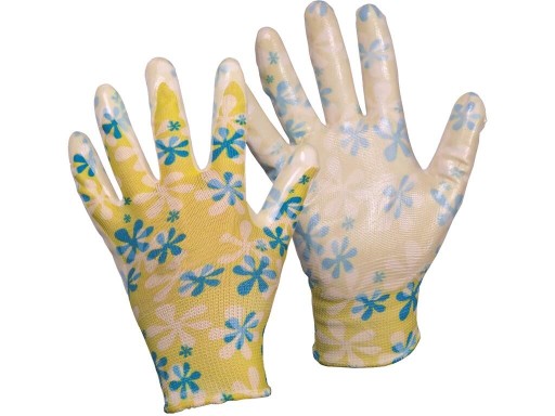 Bezszwowe dziane rękawice z nadrukiem, dłoń a palce maczane w gładkim nitrylu, elastyczny mankiet.Opakowanie z blistrem. Zalecane zastosowanie: ogród, hobby, rolnictwo, lekki montaż.