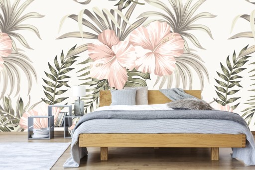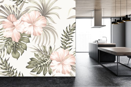 Fototapeta kwiaty i liście tropikalne retro róż pudrowy, brudny róż- kolory w stylu retro vintage - tapeta NA WYMIAR