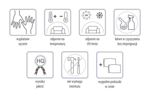 Ten wyjątkowy zestaw, składający się z dwóch sof i stolika, jest nie tylko estetycznie atrakcyjny, ale również funkcjonalny, dzięki odporności na deszcz, mróz i szkodliwe promienie UV.