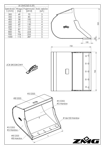 – szerokość lemiesza: #20×150 HB500 dla łyżek podsiębiernych
