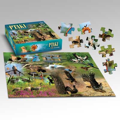 Prezentowana układanka w Formie puzzli przedstawia 14 popularnych ptaków. Są to orzeł bielik, błotniak, bocian biały, bocian czarny, żuraw, dudek, głuszec, łabędź niemy, puszczyk, dzięcioł czarny, kukułka, kraska, zimorodek, kaczka krzyżówka. Dla ułatwienia nauki każdy ptak został podpisany. Możemy je spotkać w lasach, na łąkach, polach, bagnach i jeziorach. Puzzle to forma rozrywki, która polega na składaniu dużego obrazka z niewielkich elementów o charakterystycznych kształtach. Jak się okazuje, układanie puzzli to nie tylko wyśmienita zabawa, ale także doskonałe narzędzie edukacji.