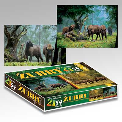 Zestaw dwóch układanek w formie puzzli zawierających 54 elementów każda przedstawiające żubry w stadzie. Żubr to największy ssak żyjący obecnie w Europie. Światowa populacja żubra wynosi 3500 sztuk- około 40% żyje w niewoli (ogrody zoologiczne, ośrodki hodowlane), pozostała część na wolności. Według danych z 2010 roku w Polsce żyły 1224 żubry, z czego 19 w ośrodkach hodowlanych i ogrodach zoologicznych. W świecie zdominowanym przez nowoczesne technologie wciąż nie brakuje osób ceniących sobie bardziej tradycyjne rozrywki. Jedną z nich jest układanie puzzli, o których słyszał zapewne każdy z nas. Jak się okazuje, te niewielkie kartonowe elementy na nowo wracają do łask, stanowiąc idealną rozrywkę nie tylko dla dzieci, ale dla całej rodziny.