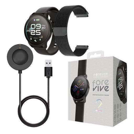 Smartwatch Forever Forevive 2 SB-330 jest kompatybilny iOS ≥ 9.0; Android ≥ 5.0. Zestaw zawiera smartwatch Forever Forevive 2 SB-330, dodatkowy pasek, podstawkę i kabel ładujący i instrukcję obsługi.