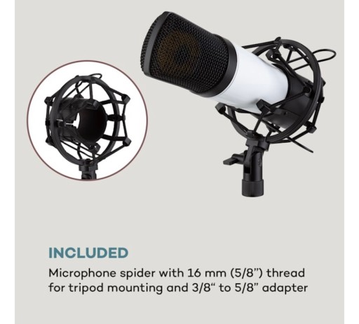 Dostarczony pająk mikrofonu upewni wielkomembranowy mikrofon auna Pro MIC-920 na dostępne statywy i stojaki mikrofonowe. Nylonowa osłona zmniejsza drgania rezonansowe i szumy, które mogą wystąpić na konstrukcji. Dzięki gwintowi 5/8 '' pająk można łatwo zainstalować na powszechnie używanych statywach mikrofonowych. Adapter 3/8 "do 5/8" skutecznie gwarantuje uniwersalne zastosowanie w przypadku innych rozmiarów gwintów.
