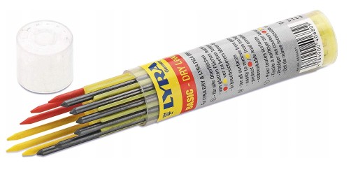 Wkłady grafitowe firmy Lyra idealnie nadają się do oznaczeń na różnych powierzchniach (ceramika, drewno, metal, plastik, szkło). Bez problemu w razie pomyłki z gładkich powierzchni można zetrzeć znakowanie za pomocą wilgotnej ściereczki. Posiadają fabrycznie naostrzone wkłady zabezpieczone w trwałym plastikowym opakowaniu. Dzięki obrotowemu magazynkowi znajdującym się w górnej części opakowania, mamy możliwość wyciągnięcia pojedynczego wkładu w wybranym przez nas kolorze (żółtym, czerwonym lub grafitu). Produkt możemy używać do trzech rodzajów ołówków firmy LYRA (Lyra Dry, Lyra Dry Profi oraz Lyra Dry Profi Led).