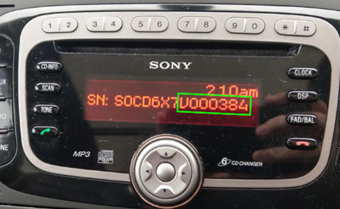 Aby odczytać numer seryjny należy wcisnąć na radiu równocześnie przycisk "1" i "6" bądź "2" i "6". Pojawi się numer seryjny składający się z 7 znaków np. V014395. Jeżeli nie ma możliwości odczytania kodu z radia to należy dokonać demontażu radia.